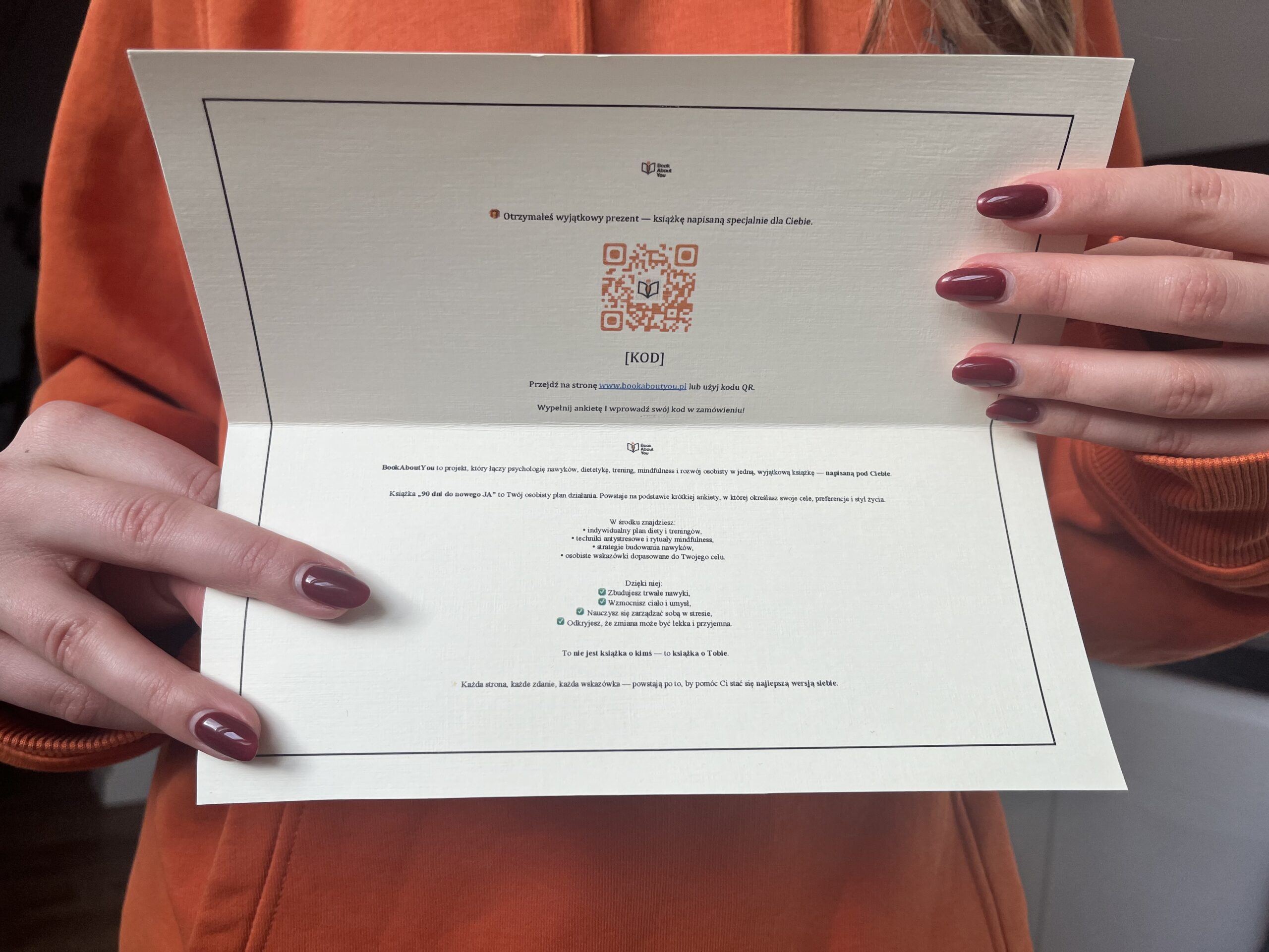 To spersonalizowana książka, która powstaje na podstawie krótkiej ankiety. Każda strona opisuje drogę, jaką obdarowana osoba chce przejść w najbliższych 90 dniach – od motywacji i nawyków po dietę, treningi i mindfulness.